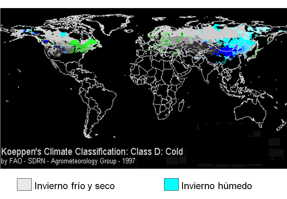 - Dw: “Invierno frío y seco”, lluvia periódica en verano.