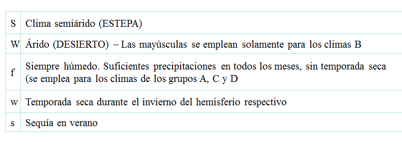 - Con frecuencia se agrega una tercera letra para indicar otras variaciones climáticas que producen diferenciaciones importantes dentro de un tipo climático: