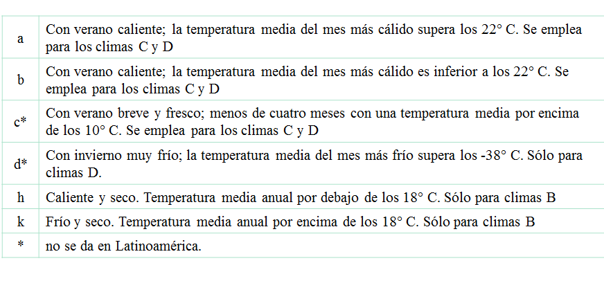 - Como señalamos arriba, la temperatura define los otros cuatro grandes tipos climáticos. Estos son subdivididos, con letras adicionales otra vez, usadas para designar varios subtipos.