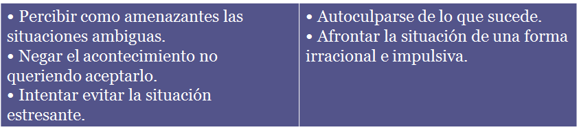 - Sentimiento de “indefensión aprendida”: sensación de que no se controla la realidad y no está en nuestras manos reaccionar frente a ello. Impotencia.