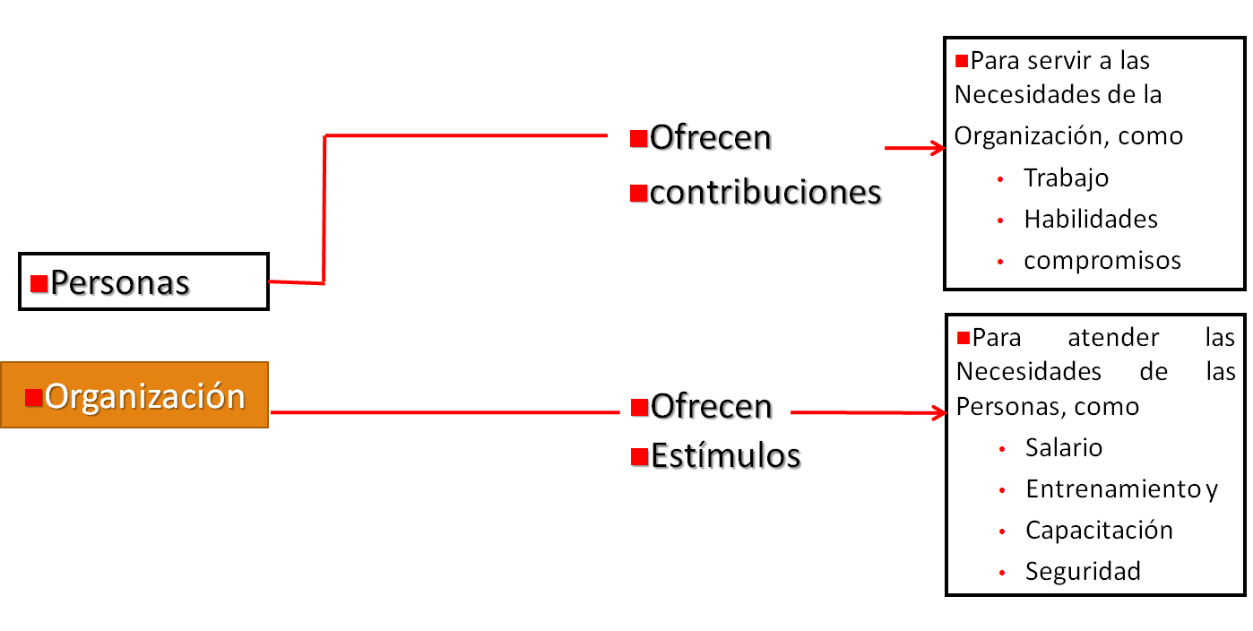 - La interacción entre personas y organizaciones se explica mediante el intercambio de incentivos y contribuciones.