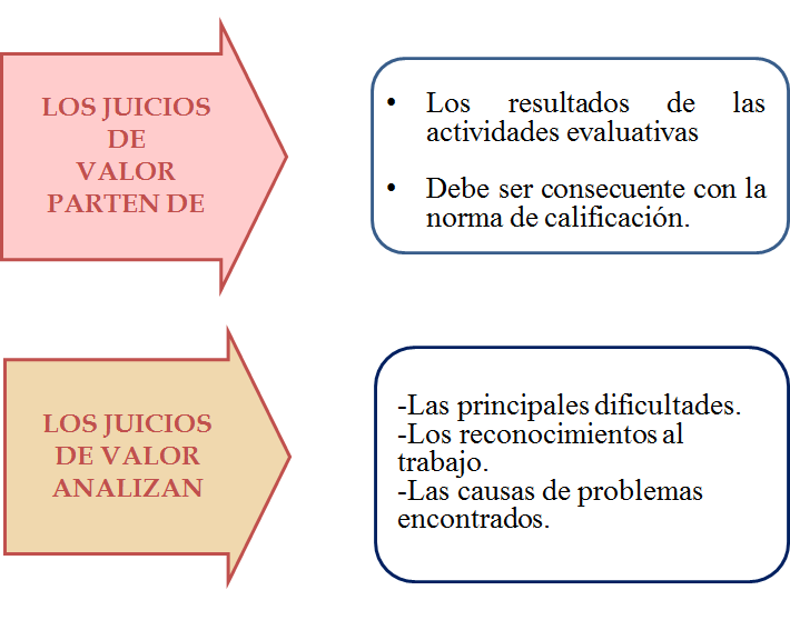 - La emisión de juicios de valor ocurre como síntesis de un proceso constante de acumulación de resultados de actividades evaluativas. En la emisión de juicios se tiene en cuenta las dificultades, se reconoce los mejores trabajos, se señalan las causas de los problemas y se señalan estrategias para corregir lo que estuvo mal.