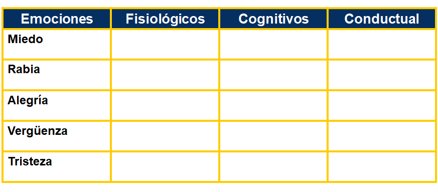 - Hacer un cuadro esquemático señalando los componentes de las emociones: