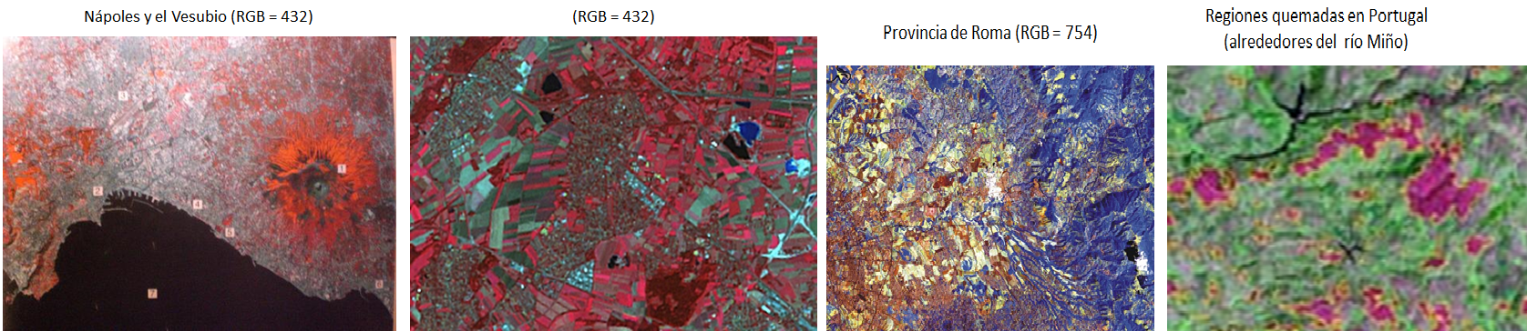 Existen múltiples combinaciones posibles de tres bandas espectrales, por lo que las imágenes obtenidas suelen tener un colorido muy extraño para nuestros ojos; sin embargo pueden resultar muy útiles para resaltar los detalles que nos interesen en cada caso concreto. En función de la combinación de bandas que elijamos, podemos obtener imágenes en color natural o en falso color