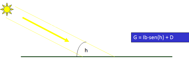 - Conociendo la radiación directa y difusa, es muy sencillo calcular la radiación global sobre plano horizontal: