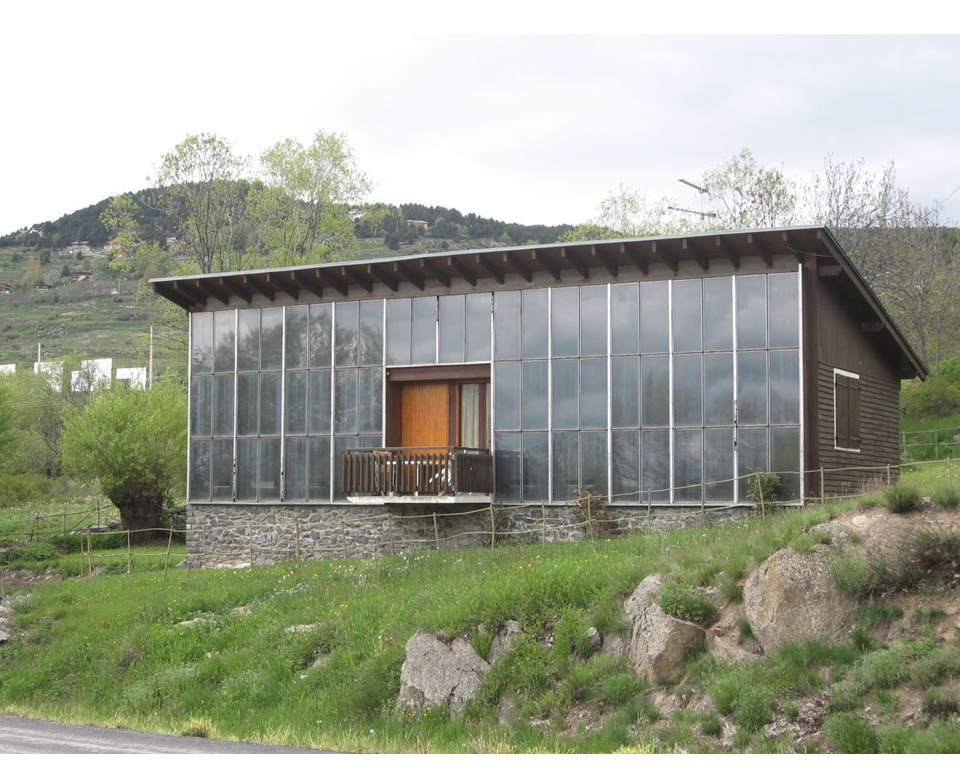 - Foto de la cabaña original del Dr. Félix Trombe. Aún en uso. Su casa personal, con mejor aislación solo tiene un 25% de fachada captora