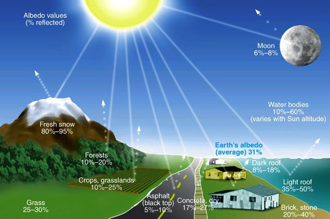 - Albedo: El albedo es crucial porque al reflejar la luz de vuelta al espacio, la Tierra evita que esa energía se absorba y caliente el planeta. Las superficies blancas y brillantes, como el hielo y la nieve, tienen un albedo alto.