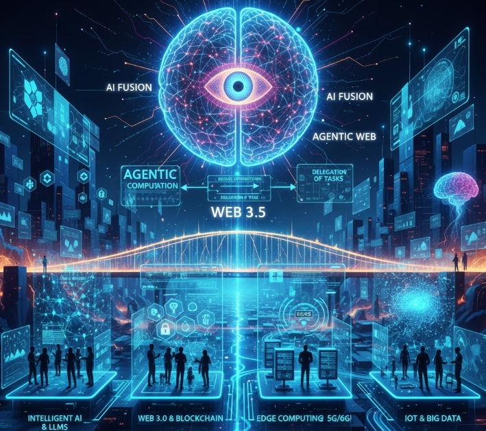 El concepto de Web 3.5 se describe como un "puente" o una fase de transición crítica entre la Web 3.0 (descentralización, blockchain, semántica) y la futura Web 4.0 (una revolución de sistemas totalmente integrados e inteligentes). Se caracteriza fundamentalmente por la fusión e intensificación de la Inteligencia Artificial (IA) con el entorno de internet, llevando a la emergencia de la "Web Agéntica".