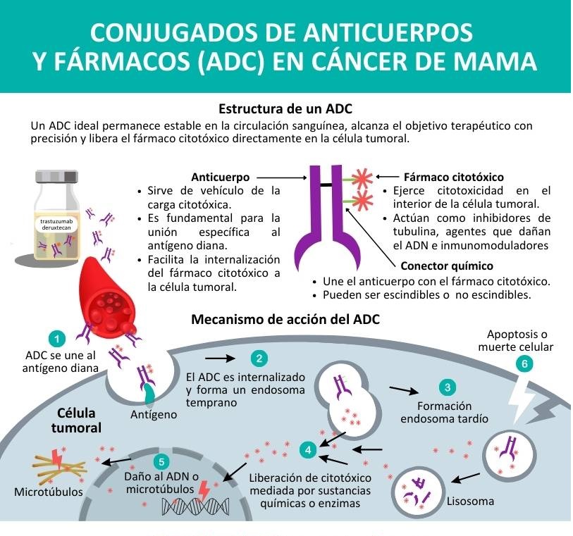 Enlazador (Linker): Este es el "mecanismo de liberación". Es una molécula que conecta el anticuerpo con el cargamento citotóxico. El linker está diseñado para ser estable en la circulación sistémica (evitando la liberación prematura del citotóxico) pero debe ser escindible o degradable una vez que el ADC se une a la célula tumoral y es internalizado (por endocitosis) en el lisosoma, permitiendo la liberación selectiva del fármaco dentro de la célula cancerosa.